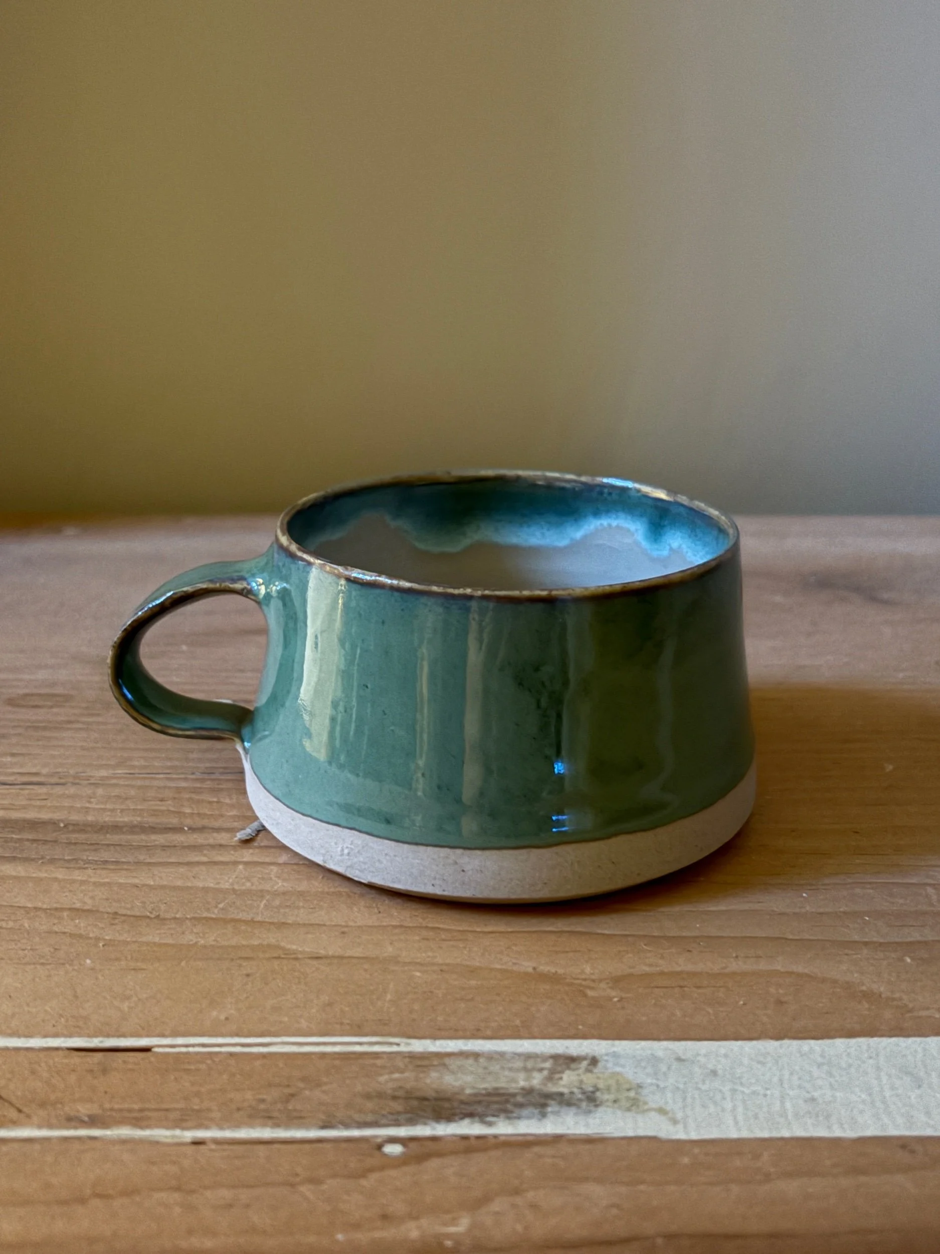 Handcrafted ceramic mug with a calm, earthy presence. Finished in a rich pistachio glaze with natural drips and subtle variations, each piece is one of a kind. The softly curved form sits on an unglazed stoneware base, offering a pleasing contrast in texture and color. A comfortable handle and gently rounded rim make it ideal for everyday coffee or tea rituals. Simple, durable, and timeless—designed to be used and enjoyed daily.
